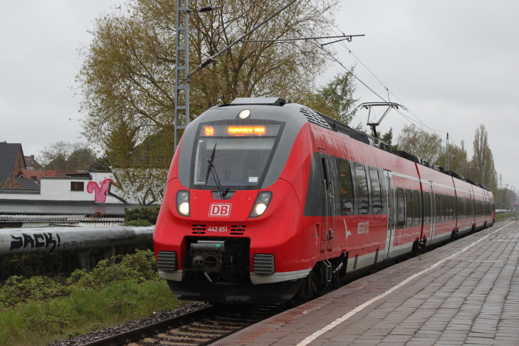 442 851 als S1(Warnemünde-Rostock)bei der Einfahrt im Haltepunkt Rostock-Holbeinplatz.05.05.2017