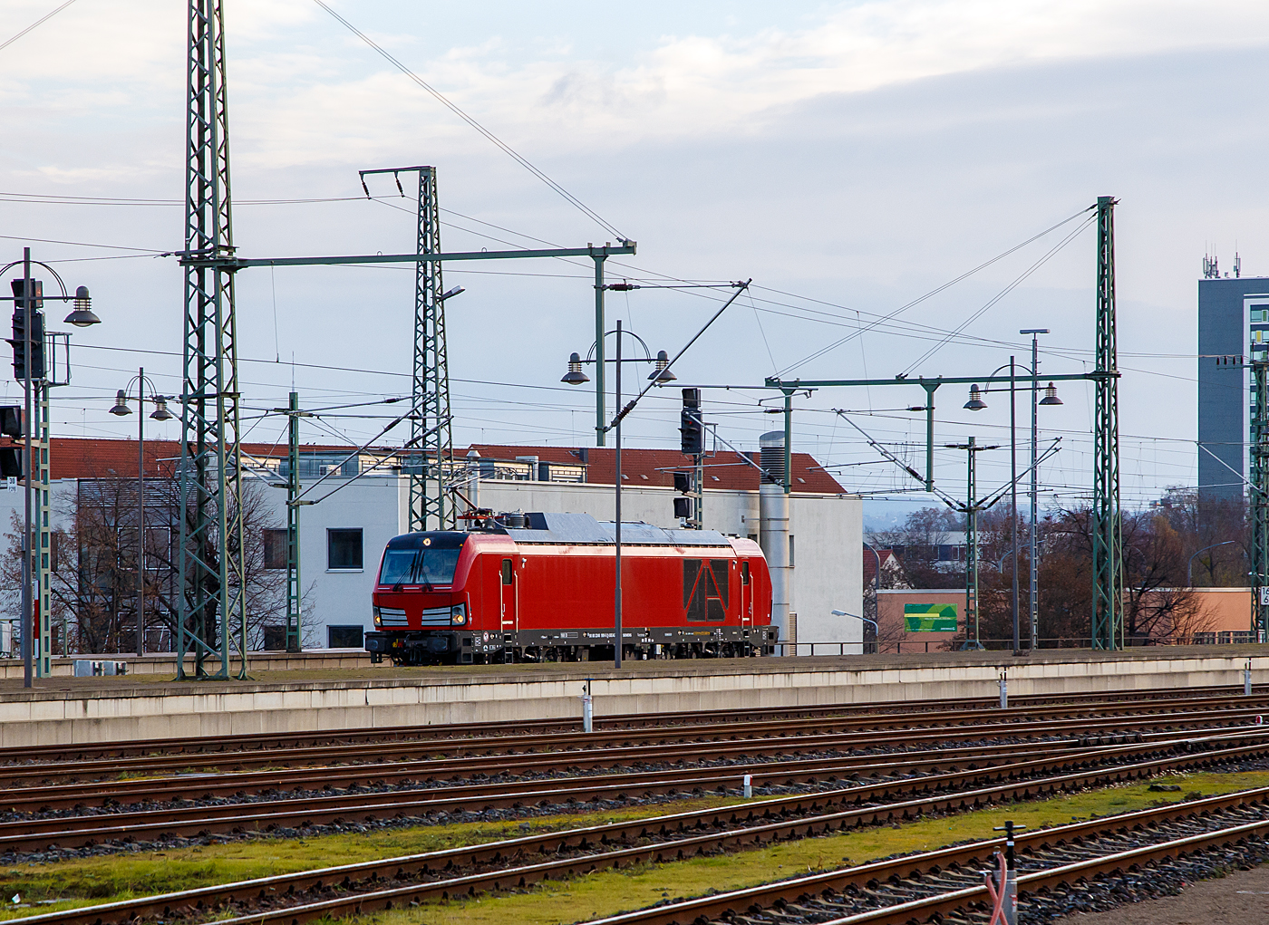 Diese Lokomotivbaureihe wird man bald auf deutschen Gleisen wohl öfters sehen können. Denn die DB Cargo erneuert seine Rangier- und Strecken-Lokflotte und beschafft neue Zweikraftlokomotiven der BR 248, als Ersatz für die älteren Diesellokomotiven der Reihe 294 (V 90). Es wurde Rahmenvertrag mit dem Hersteller Siemens Mobility über bis zu 400 Fahrzeuge, die einem Investitionsvolumen von deutlich über einer Milliarde Euro entsprechen, angeschlossen. Geliefert werden Lokomotiven vom Typ Vectron Dual Mode mit spezifischen Anpassungen für das von DB Cargo geplante Einsatzspektrum. Zunächst bestellt die DB Cargo 100 Loks der Baureihe 248. Die Auslieferung startet ab 2023. Die DB Loks sind aber stark modifiziert, so soll bei ihnen die Achslast maximal 21 t betragen (statt 22,5 t). Sie erhalten in den Führerständen einen zusätzlichen Seitenfahrschalter und einem Mikrofon statt des gewohnten Seitenfensters versehen. Hier fährt am 08.12.2022, die sehr neue (Baujahr 2022) Siemens Vectron Dual Mode 248 999-5 (90 80 2248 999-5 D-SIEAG) der Siemens Mobility GmbH (evtl. Vorführmaschine) durch den Hauptbahnhof Dresden in westlicher Richtung. Die Vectron DM wurden 2022 von Siemens Mobility GmbH in München-Allach unter der Fabriknummer 23166 gebaut. Der Vectron Dual Mode vereint die Vorteile einer vollwertigen Diesellokomotive mit denen von elektrischen Lokomotiven. Dank des leistungsstarken Dieselantriebs sowie der Ausstattung für die Nutzung der Fahrleitung kann man jederzeit flexibel auf die Traktionsanforderungen reagieren. So bleibt man immer in Bewegung, egal ob mit oder ohne Fahrdraht. Wo ein Fahrdraht ist, sollte man ihn nutzen. Denn der Betrieb unter Oberleitung ist im Vergleich zum Dieselbetrieb deutlich kosteneffizienter und umweltfreundlicher. Doch weil es in Deutschland noch lange Zeit Strecken geben wird, die nicht vollständig elektrifiziert sind, fahren viele Diesellokomotiven unter Fahrdraht weiter. Das ist aber ökonomisch und ökologisch wenig sinnvoll. Dies ist hier ein Beispiel einer echten Alternative. Mit der Vectron Dual Mode ist es möglich Güterzüge aus dem Umland umweltschonend in die Zentren der Ballungsräume zu befördern. Nur so einfach, wie in der Siemens Werbung ist es auch nicht, denn die Lok vier Achsen (Bo’Bo’) und wiegt 90 t, so ergibt sich eine Achslast von 22,5 t. Nicht elektrifizierte Nebenstrecken haben nicht gerade alle von min. D2 (22,5 t), und können so auch nicht befahren werden. Auch die Leistung der DM im Vergleich zu heutigen Hochleistungselektrolokomotiven ist mit 2.400 kW erheblich geringer. Mit den Dieselstreckenloks kann sie aber mit 2.000 kW sehr gut mithalten, zudem liegt die Anfahrzugskraft bei stattlichen 300 kN. TECHNISCHE DATEN der Siemens Vectron Dual Mode (BR 248) Spurweite: 1.435 mm Achsformel: Bo'Bo' Länge über Puffer: 19.975 mm Drehzapfenabstand: 10.800 mm Achsabstand im Drehgestell: 2.700 mm Breite: 3.020mm Höhe: 4.220 mm Raddurchmesser : 1.100 mm (neu) / 1.020 mm (abgenutzt) Gewicht: 90 t (bei vollen Vorräten) Achslast: 22,5 t Spannungssysteme (bei E-Betrieb): 15 kV, 16,7 Hz Dieselmotor: MTU 16V 4000 R84 (16-Zylinder-V-Motor) Dieselmotorleistung an der Kurbelwelle: 2.400 kW Max. Leistung am Rad: 2.400 kW bei E-Antrieb / 2.000 kW bei D-Antrieb Höchstgeschwindigkeit:160 km/h Antriebsart: elektrisch oder dieselelektrisch Kraftübertragung :Teilabgefederter Antrieb (Ritzelhohlwellenantrieb) Kraftstoffbehälter Nutzvolumen: 2.600 l Anfahrzugskraft: 300 kN Elektrische Bremskraft: 150 kN Elektrische Bremsleistung (am Rad): E-Betrieb 2.100 kW / Dieselbetrieb 1.700 kW Doppeltraktion: Über WTB ÖBB mit typgleichen Fahrzeugen sowie Vectron E, Vectron DE und ER20 Zugsicherung: PZB / für ETCS vorbereitet