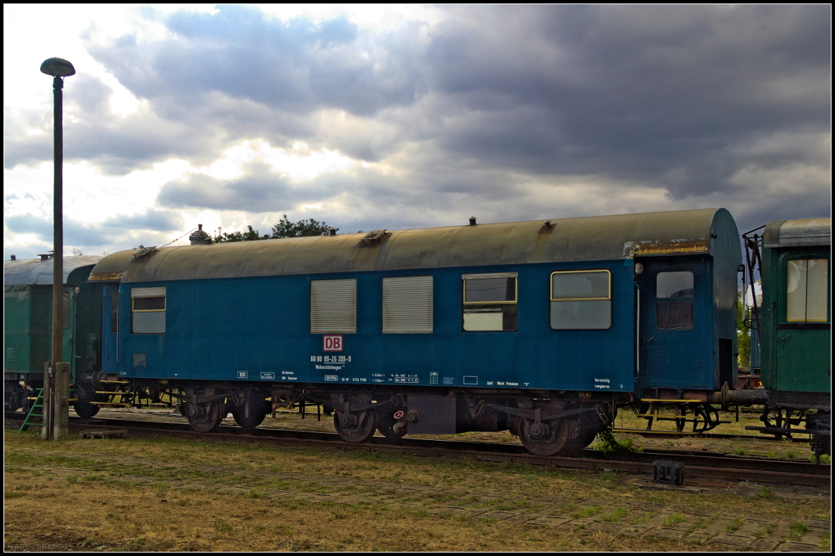 Hinter dem Loksuppen der Dampflokfreunde Salzwedel e.V. in Wittenberge stand am 25.08.2018 dieser ehemalige Begleitwagen der Deutschen Bundespost, eingestellt bei der HSL-Logistik. Am Brandenburg-Tag konnte man den Wagen, an dem das Museum geöffnet hatte, entdecken (03 80 809 5 007-4 Begleitwagen)