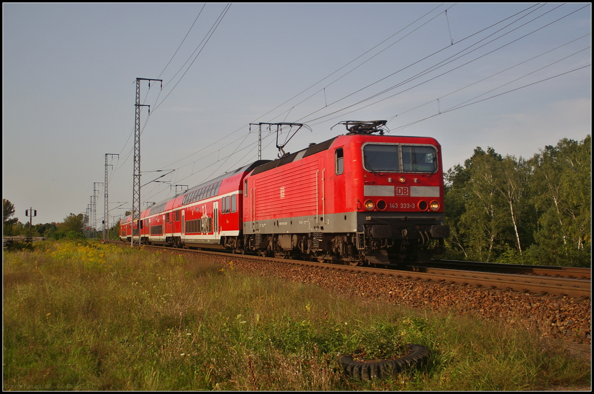 DB Regio 143 333-3 fuhr auf Dienstfahrt am späten Nachmittag als RB14 Nauen am 30.08.2017 durch die Berliner Wuhlheide nach Schönefeld