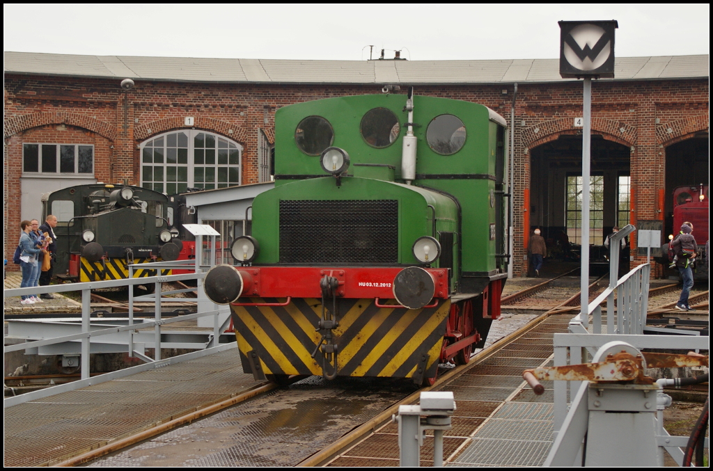 Die kleine DKL 0605, genannt 'Pia', befand auf der Drehscheibe um die um ein vielfaches größere 118 748 aus dem Lokschuppen zu ziehen. Zu sehen war die Stangenlok von Deutz am Brandenburg-Tag 2018 am 25.08.2018 im Historischen Lokschuppen Wittenberge.