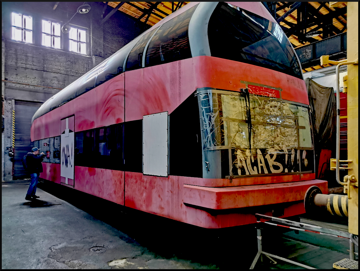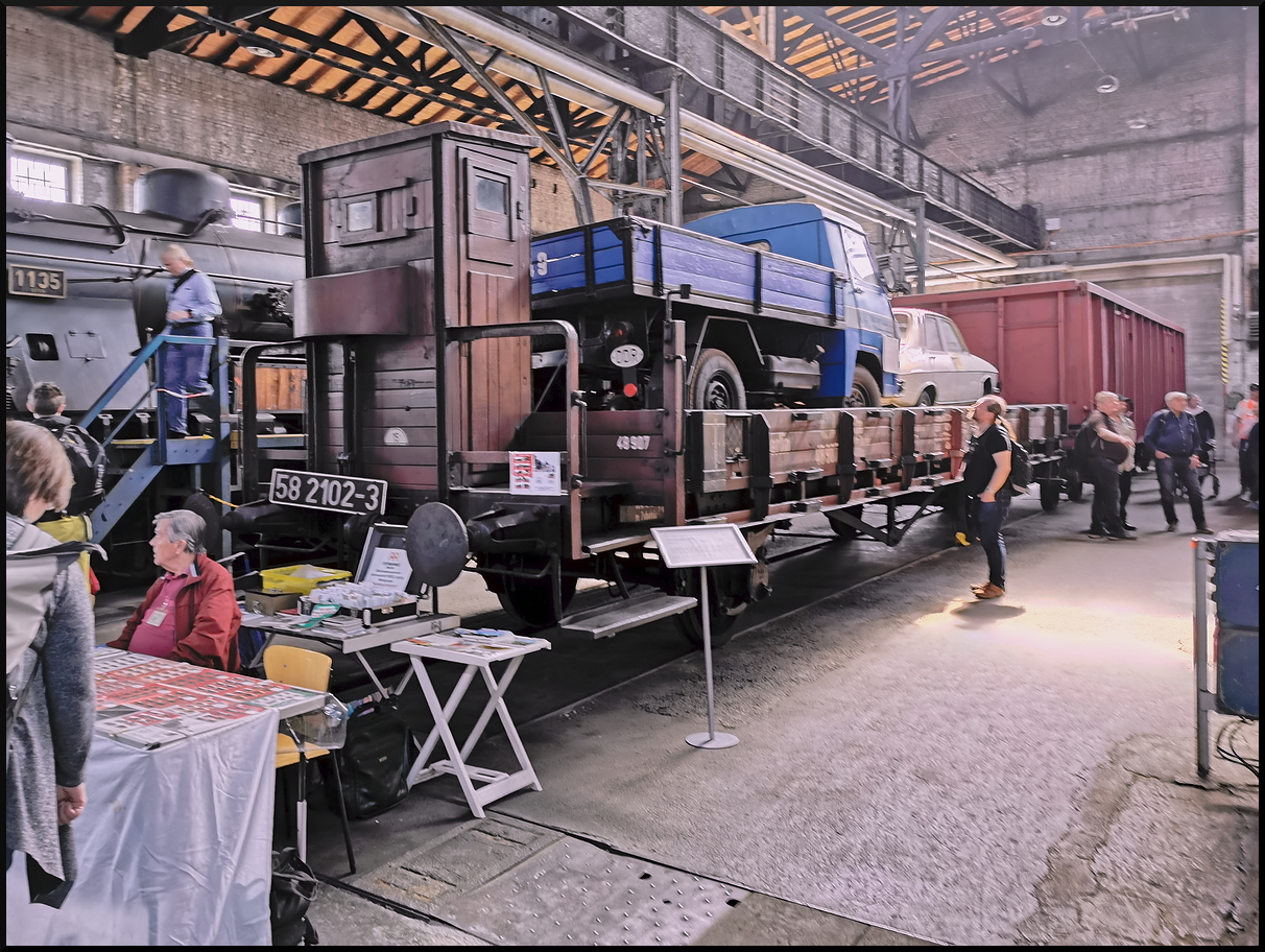 Hinter DB 40 80 955 0043-0 versteckt sich ein Schwingerwaggon der DB Versuchsanstalt. Er wurde als Brückmeßwagen der Brückmeßgruppe Süd eingesetzt. Sinn war durch entsprechende Messgeräte die Eigenfrequenz und somait Belastbarkeit von Brücken zu ermitteln. Er hat zwei Brückenschwinggeräte mit Steueraggregaten zur Erzeugung von Drehungen Zentrifugalkräfte von 2t und 12t in einem Frequenzbereich von 4 bis 20 Hertz sowie 5,1 bis 15 Hertz. Bei Versuchen wurden die Aggregate auf die Gleise herab gelassen. Der Wagen stand im Depot der IG Bw Dresden-Altstadt e.V. und konnte mit Mühe am 12.05.2025 fotografiert werden. Die Person links war selbst mit Fotografieren beschäftig und ist ein Besucher während des 17.Dresdner Dampfloktreffens.