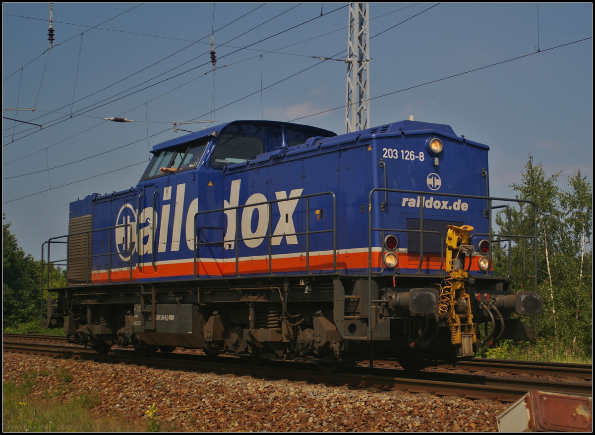 Raildox 203 126-8 kam am 09.07.2017 nach erfolgter Überführung von Tads-Wagen nach Berlin Nordost solo wieder zurück und fuhr grüßend durch die Berliner Wuhlheide. Gruß zurück an den Tf!