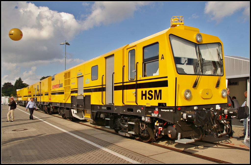 InnoTrans 2016 in Berlin: Der Hochgeschwindigkeits-Schienenfräszug (HSM) von Schweerbau dient der präventiven Bearbeitung von Schienen. Dazu gehört das beseitigen von Riffeln, Schlupfwellen und größeren Schienenfehlern. Die Bearbeitung der Schienen kann in Tunneln, auf Brücken oder auf Gleisen mit Stromschiene erfolgen. Die Bearbeitung erfolgt aus Geräuschlastigen Gründen mit der Schleifmaschiene GWM. Einige Daten: LüP 51.900 mm, Gesamtgewicht 190 t, Radsätze 12, Motorleistung 750 kW, Höchstgeschwindigkeit 100 km/h, Tank 4.000 Liter, Computergesteuertes Fräsen (staub-, funken- und profilfrei), 2 Fräseinheiten, Fräsgeschwindigkeit 800 bis 3.000 m/h, Mindestabtrag 0,2 mm, kleinster Arbeitsradius 150 m (UIC-Nummer D-SBAU 99 80 9427 013-4)