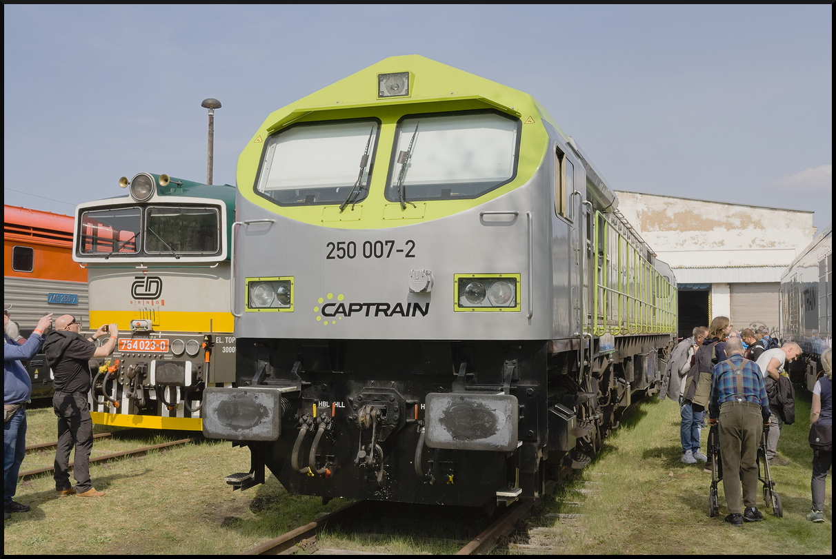 ITL 250 007-2 ist die zweite Gastlok des Unternehmens, das sich auf dem Gelände an der Schiebebühne am 12.04.2025 während des 17. Dresdner Dampfloktreffens präsentierte. Auch hier konnte der Führerstand besichtigt und einmal die Motoren gestartet werden. Links lugt die erste Gastlok von ČD Nostalgie hervor (92 80 1250 007-2 D-ITL)