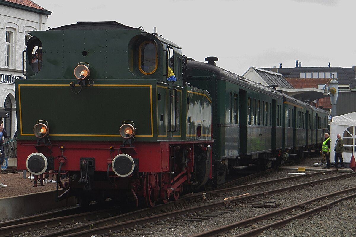 Am 6 Mai 2023 treft Lok-22 TOM mit der Dampfpendelzug aus Eeklo in Maldegem ein während die Dampftage der SCM.