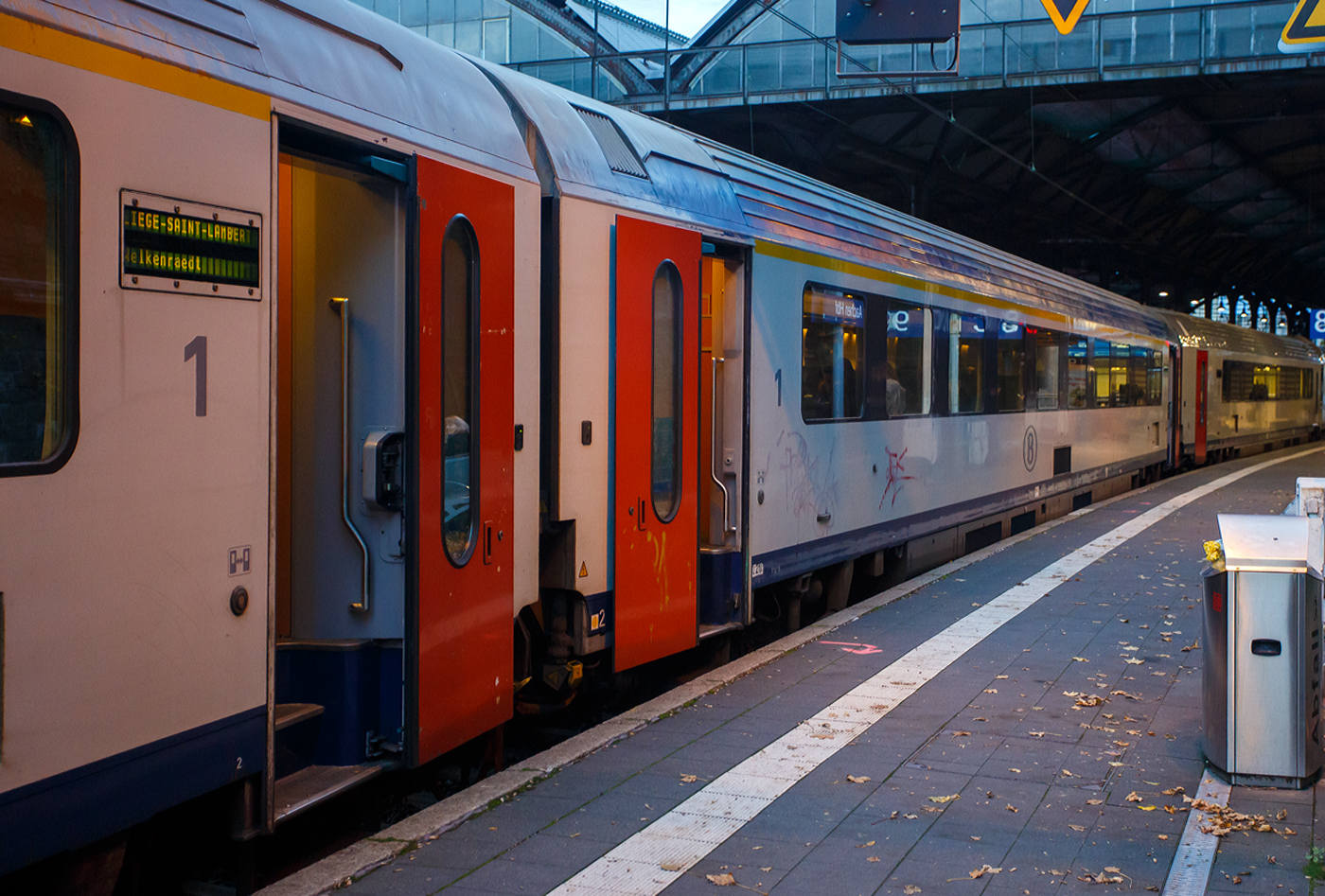 SNCB/NMBS - I11 Reisezugwagen der 1. Klasse, Apm 61 88 10-90 018-2 B-B, ex 11818, eingereiht im Zugverband einen IC, am 21 Oktober 2025 im Bahnhof Liège Guillemins (Lüttich-Guillemins).