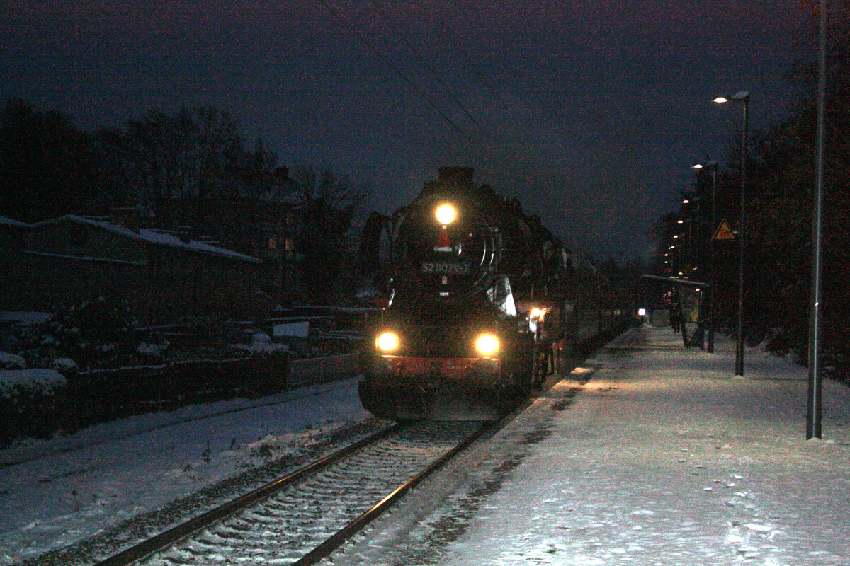 Am letzten Sonntag des Jahres 2025 veranstaltet Gleis Glück wieder eine Sonderfahrt. Da die 23 058 mit einem kapitalen Lagerschaden ausgefallen ist war die 77 250 und die 52 7409 mit einem aus vier Silberlingen bestehendem Zug auf Rundkurs. Würzburg Hbf >Gemünden am Main>durch das Werntal gen Schweinfurt, von wo aus es zurück nach Würzburg Hbf ging.28.12.2025.