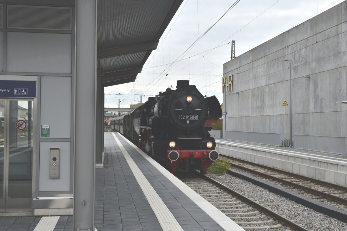 52 8168 steht am Bahnsteig Gleis 2 mit dem Seenland Express gen Gunzenhausen.  11.10.2025