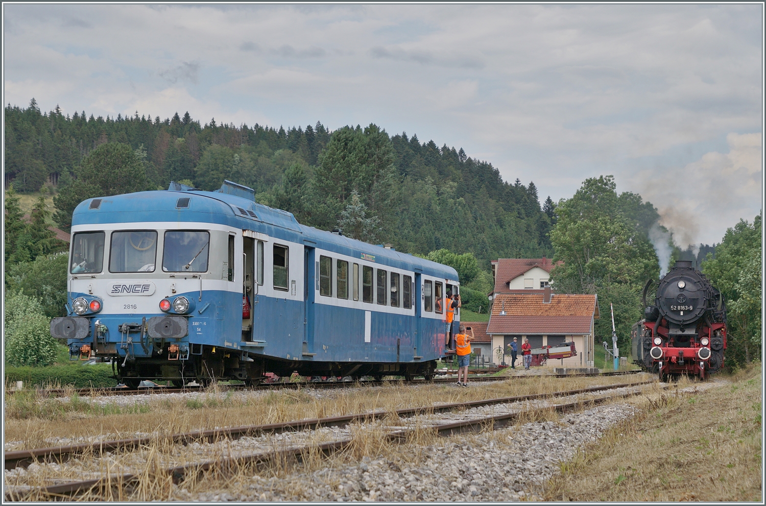 Das Bild zeigt den X 2816 beim Abwarten des Gegenzuges mit der DR  52 8163-9 in Le Touillon, bei bei Km 58 J-E / J-S / SBB bzw. Km 467 PLM / SNCF. Es dürfte der erste X 2800 sein, der auf dieser Strecke zum Einsatz kommt.