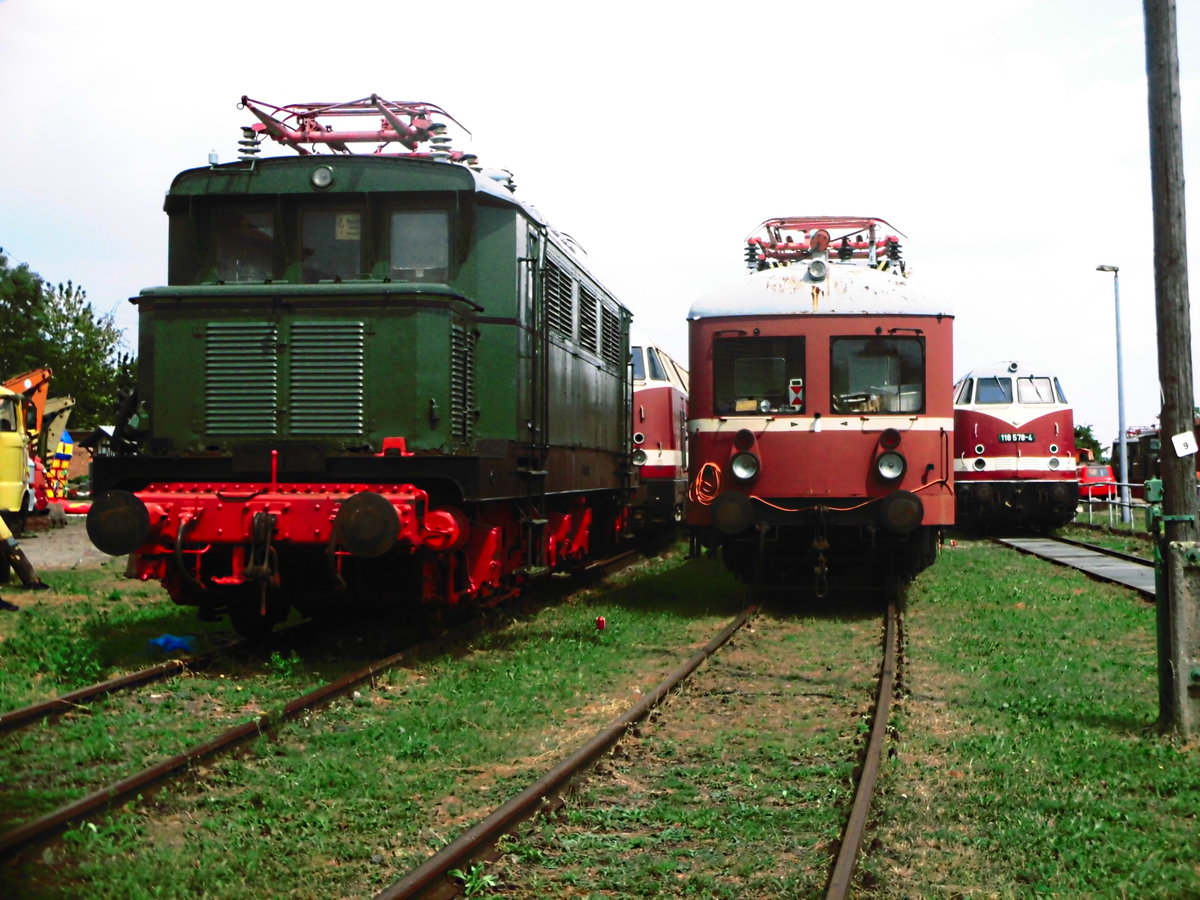 W50 Kran, E44 XXX, ein ORT und daneben die 118 XXX im Eisenbahnmuseum Weimar am 4.8.18