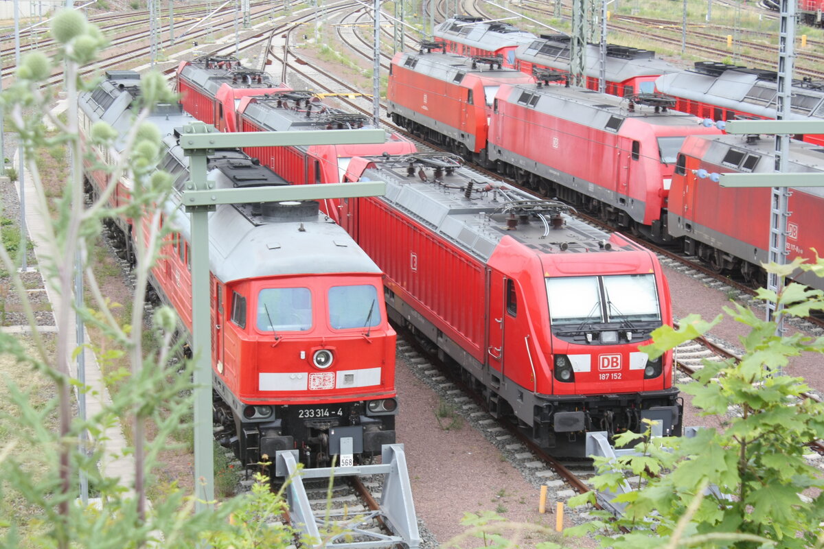 233 314 und 187 152 in der Abstellung am Bw Halle G am 13.6.21
