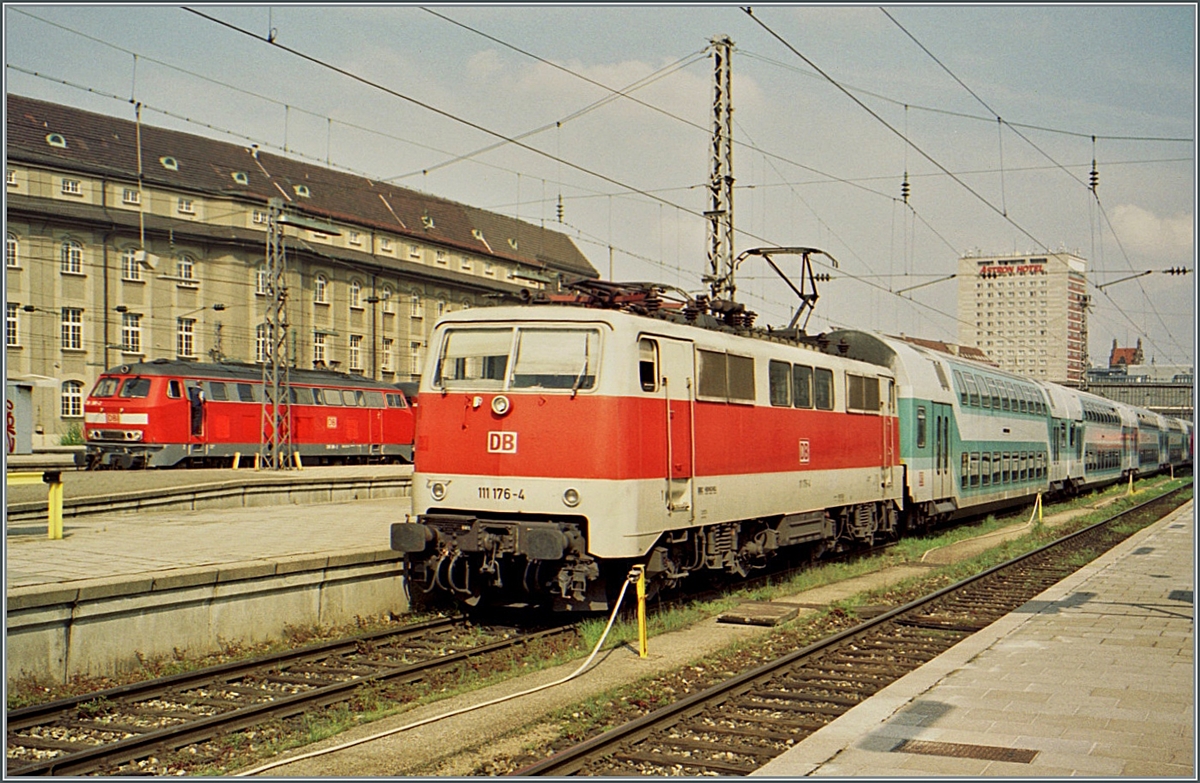 Die RB 58317, am 18.Juli 2013 mit 111-107 und 3 n-Wagen, hat in Haßfurt einen planmäßigen Aufenthalt von 14:13 Uhr bis 14:21 Uhr. Hier sonnt sich der Zug noch etwas, bis es dann in Kürze weiter nach Bamberg geht.