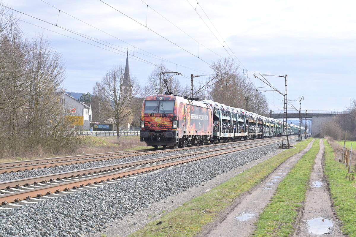 TXL 193 878 " Wir brennen für was wir tun" mit einem Autozug am Haken gen Karlstadt fahrend In Thüngersheim. 17.2.2024
