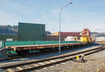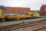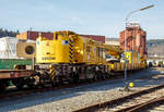 Drehgestellflachwagen mit Rungen als Schutzwagen 80 80 3900 001-9 D-HGUI (Gattung Rs) zum 50t-KIROW-Schienenkran TELVAR 50-1 der Hering Bau (Burbach), Schweres Nebenfahrzeug Nr. 97 82 35 5019-1, beladen u.a. mit der 20t Traverse, abgestellt am 09.03.2019 in Siegen-Eintracht auf dem Gelände der KSW Kreisbahn Siegen-Wittgenstein GmbH.