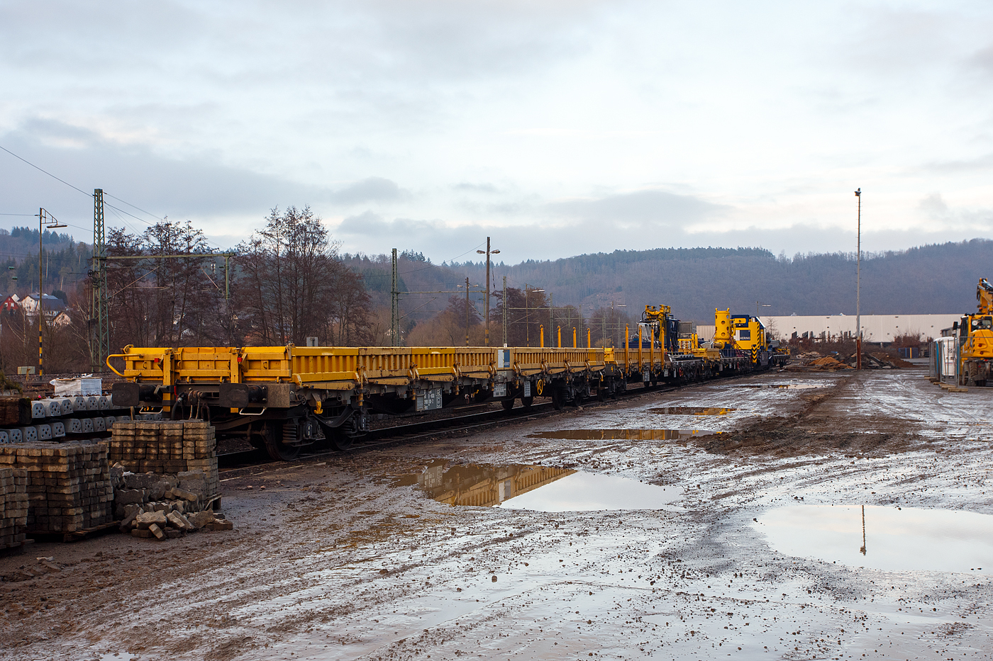Vierachsiger Drehgestell-Flachwagen, 37 80 3999 048-6 D-HGUI, der Gattung Res als Kran-Schutzwagen auslegerseitig zum KIROW Multi Tasker KRC 810 T (D-HGUI 99 80 9419 024-1), u.a. beladen mit der Traverse, Anschlagmittel und sonstiges Zubehör), am 29 September 2025 beim Bahnhof Betzdorf/Sieg.