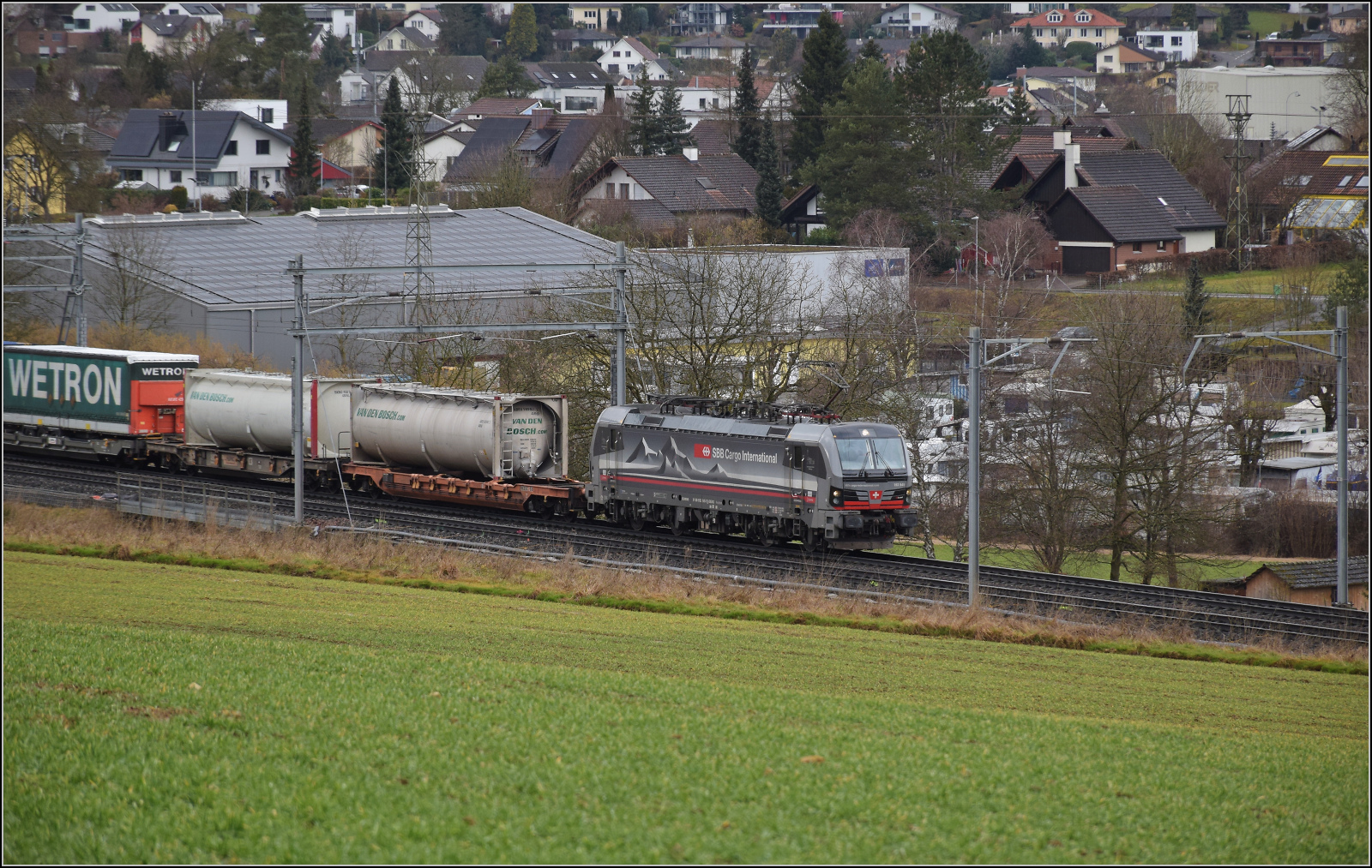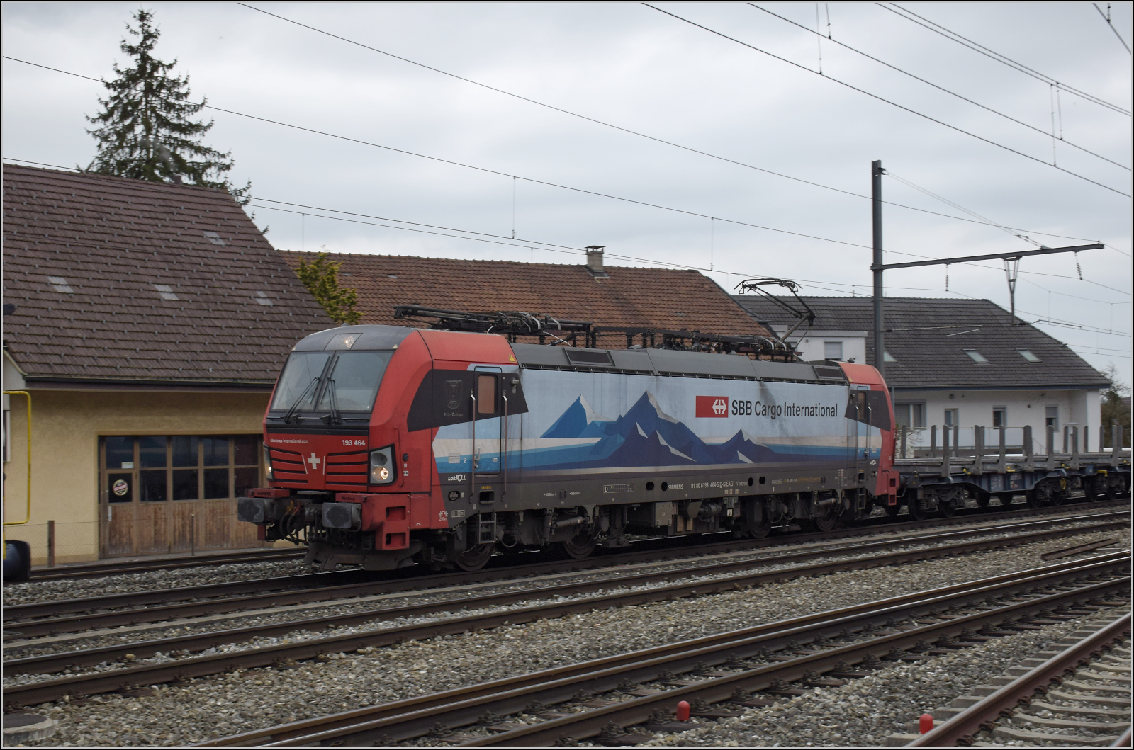 Ganz nebenbei bringt noch 193 464 'Arth Goldau' einen Güterzug durch Niederbipp Richtung Oensingen. Die Ortsdurchfahrt ist durchaus beengt und ein Dreischienengleis (im Vordergrund) ist notwendig. Februar 2026.