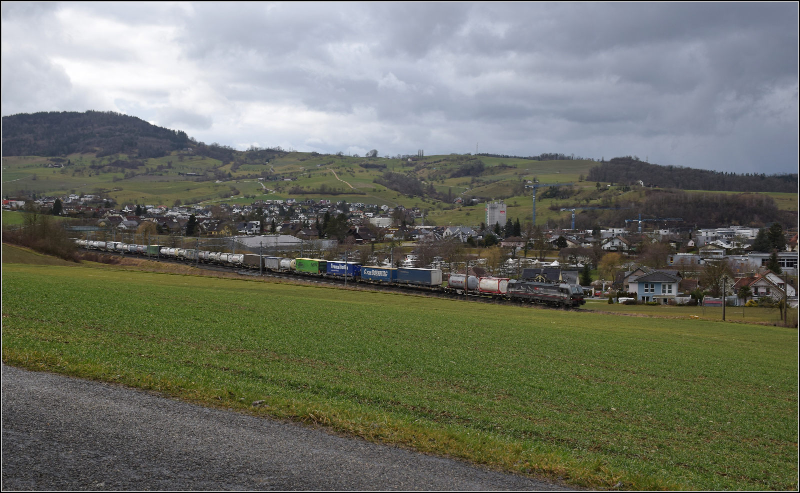 Schlechtwetter und ein Baustellendrama bei Frick. 193 068 und 193 052 ziehen für SBB Cargo einen Kesselwagenzug den Bözberg hoch. Auf der temporär eingerichteten Bereitstellungsfläche für eine Bahnbaustelle war schon länger eine LKW-Fahrerin zu gange. Sie hatte sich offenbar festgefahren. Die über das Feld gelegte Schotterfläche war wohl zu steil angelegt und nicht genug verdichtet. Februar 2026.