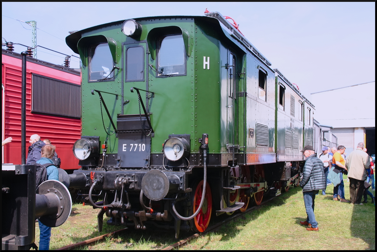 E 44 507 steht mit mehreren anderen historischen Lokomotiven auf dem Bw-Gelände (Leihgabe DB Museum Nürnberg, Eisenbahnfest des TEV zum Weimarer Zwiebelmarkt, Weimar 10.10.2009)