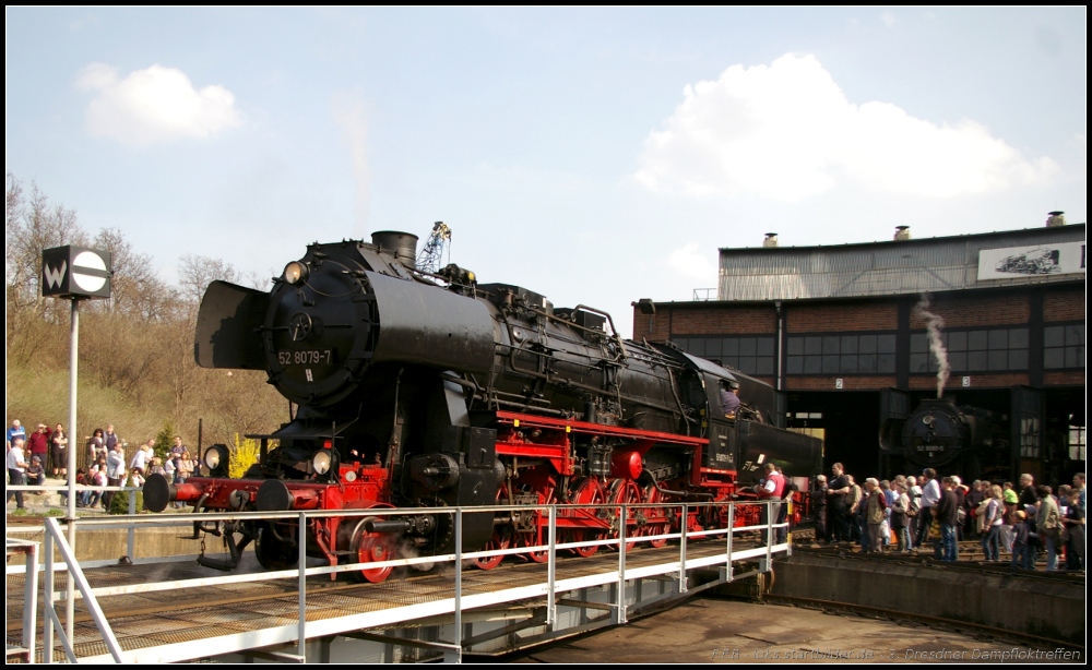 52 8079 der Dampf plus GmbH ist ebenfalls zu Gast beim 3. Dresdner Dampfloktreffen und zeigt sich den Besuchern (gesehen Dresden-Altstadt 02.04.2011)