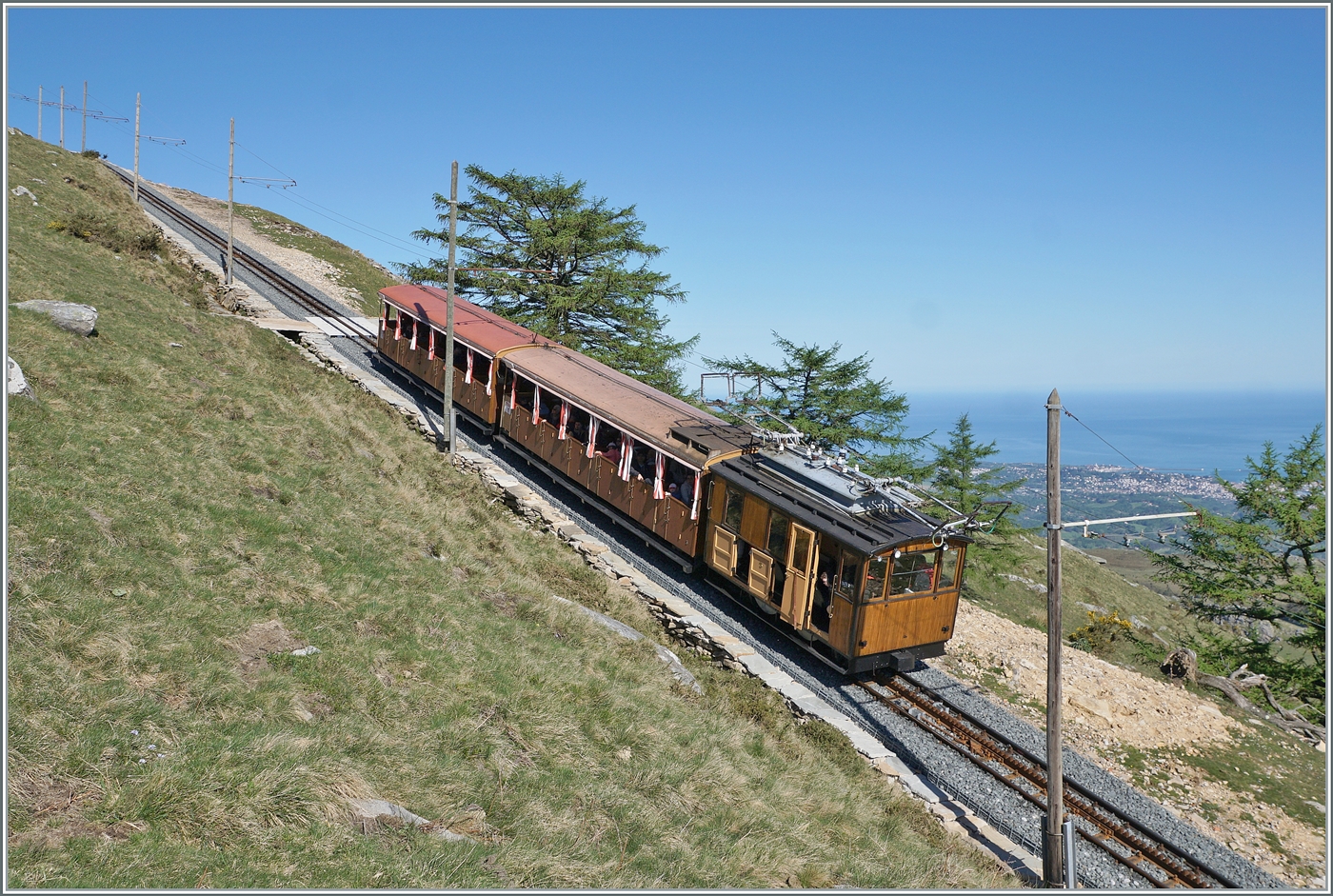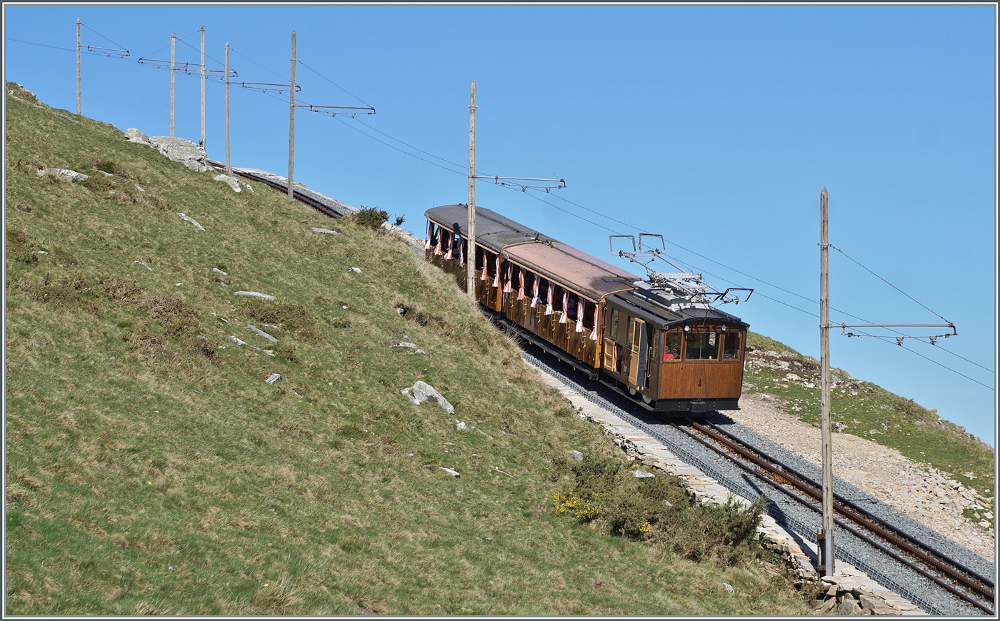 Steil bergauf führt die Trasse der Chemin de Fer de La Rhune, welches eine He 2/2 Drehstromloks mit ihrem Zug gerade befährt. Schön zu sehen, die erst vor kurzem total erneuerten Gleise der Bahn. 12. April 2024
