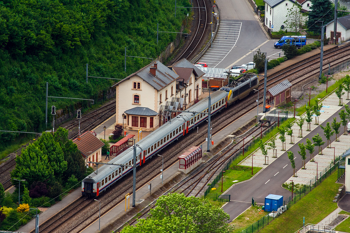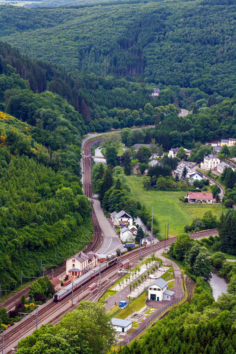 Vom Parkplatz beim Licée in Clervaux habe ich versucht den vorderen Teil des Gleisumbauzuges aufzunehmen was mir nicht ganz gelang, der Zug war einfach zu lang. 05.04.2012