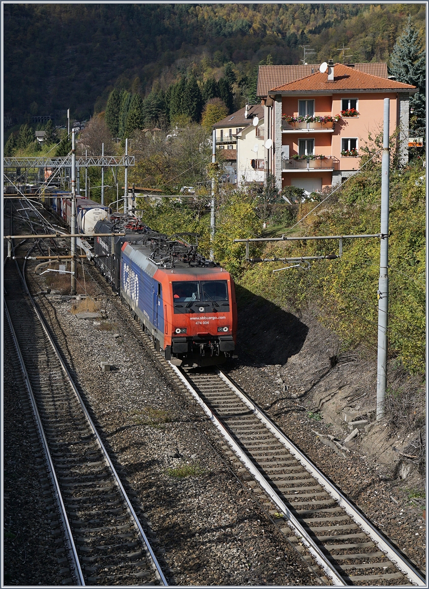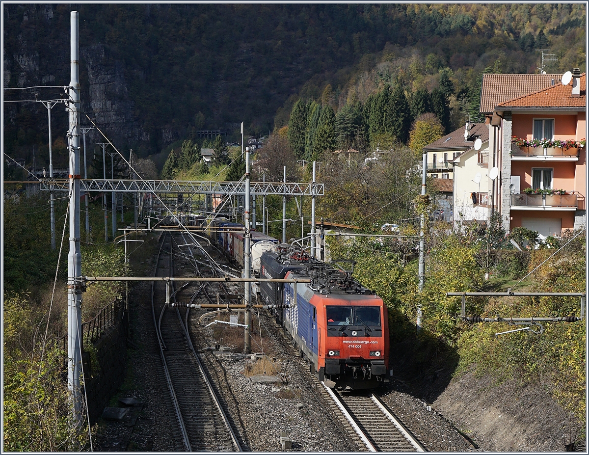 Die SBB Re 474 004 und eine weitere Lok dieses Typs verlassen Varzo mit einem Güterzug in Richtung Domodossola. 27. Oktober 2017
