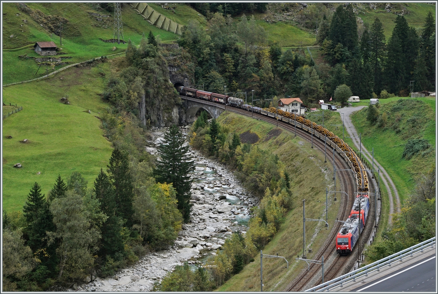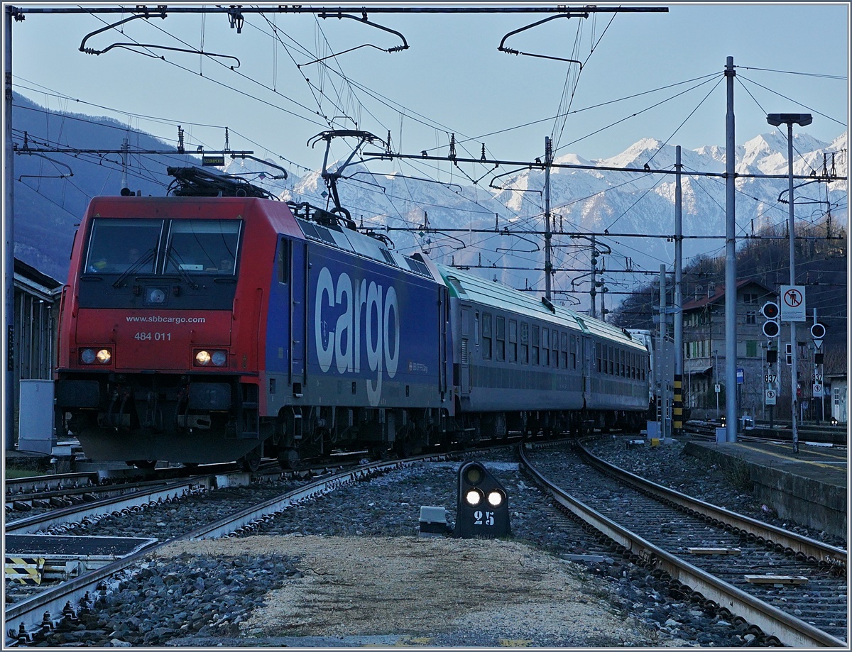 Die SBB Re 484 010 mit einer RoLa im noch schattigen Bahnhof von Domodossola.
