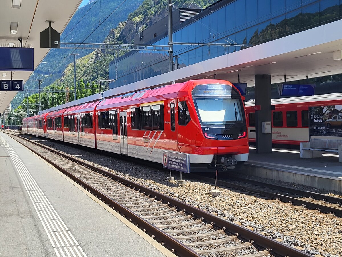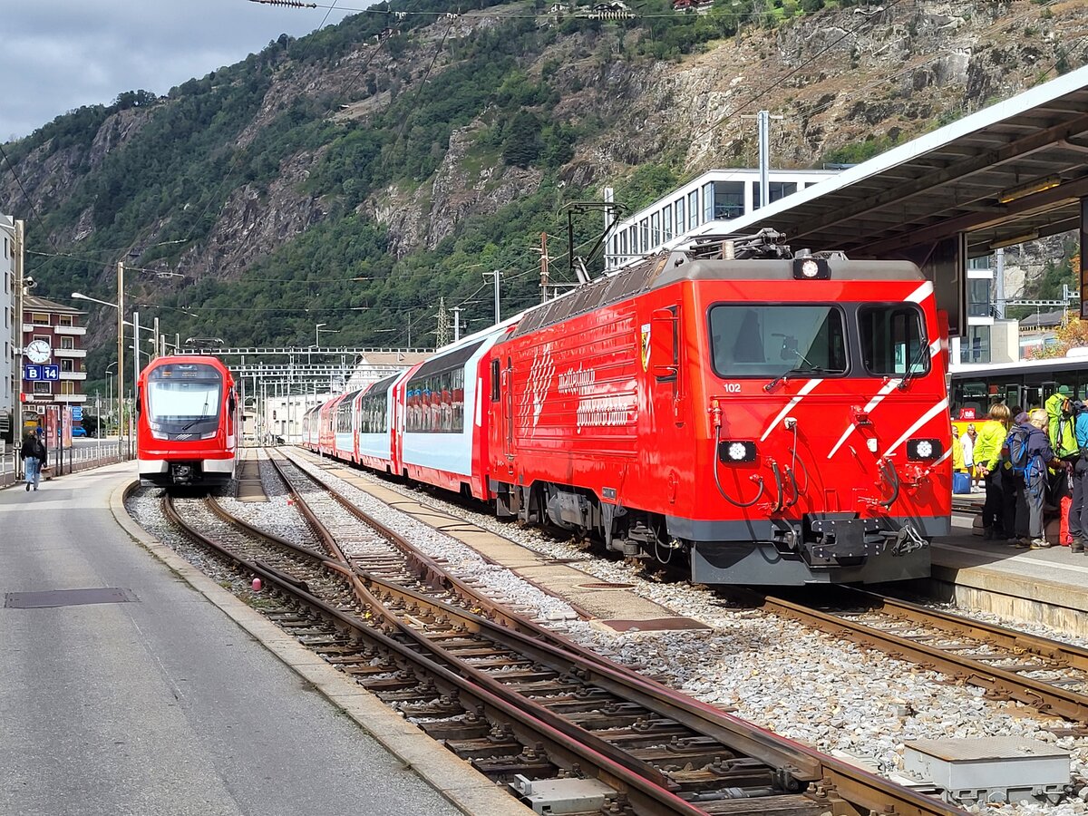 Während die MGB HG 4/4 II N° 4 mit ihrem Regio von Zermatt in Visp für die Rückfahrt nach Zermatt wendet, erreicht eine SBB Re 460 mit ihrem IR 61 von Brig nach Basel den Bahnhof von Visp.