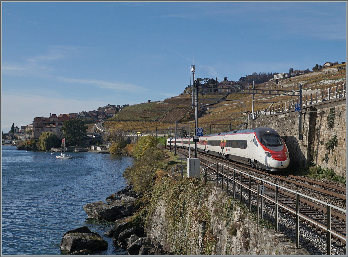 Der SBB RABe 503 (ETR 610) macht auf die neue Verbindung MIlano-Frankfurt aufmerksam, welche ab dem Fahrplanwechsel angebont wird.