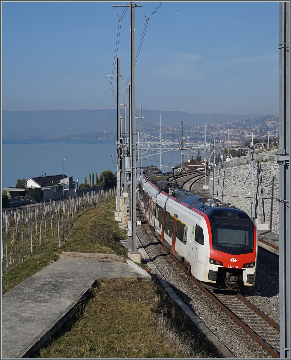 Ein SBB RABe 523 auf der Fahrt von Vallorbe nach Lausanne bei Arnex.