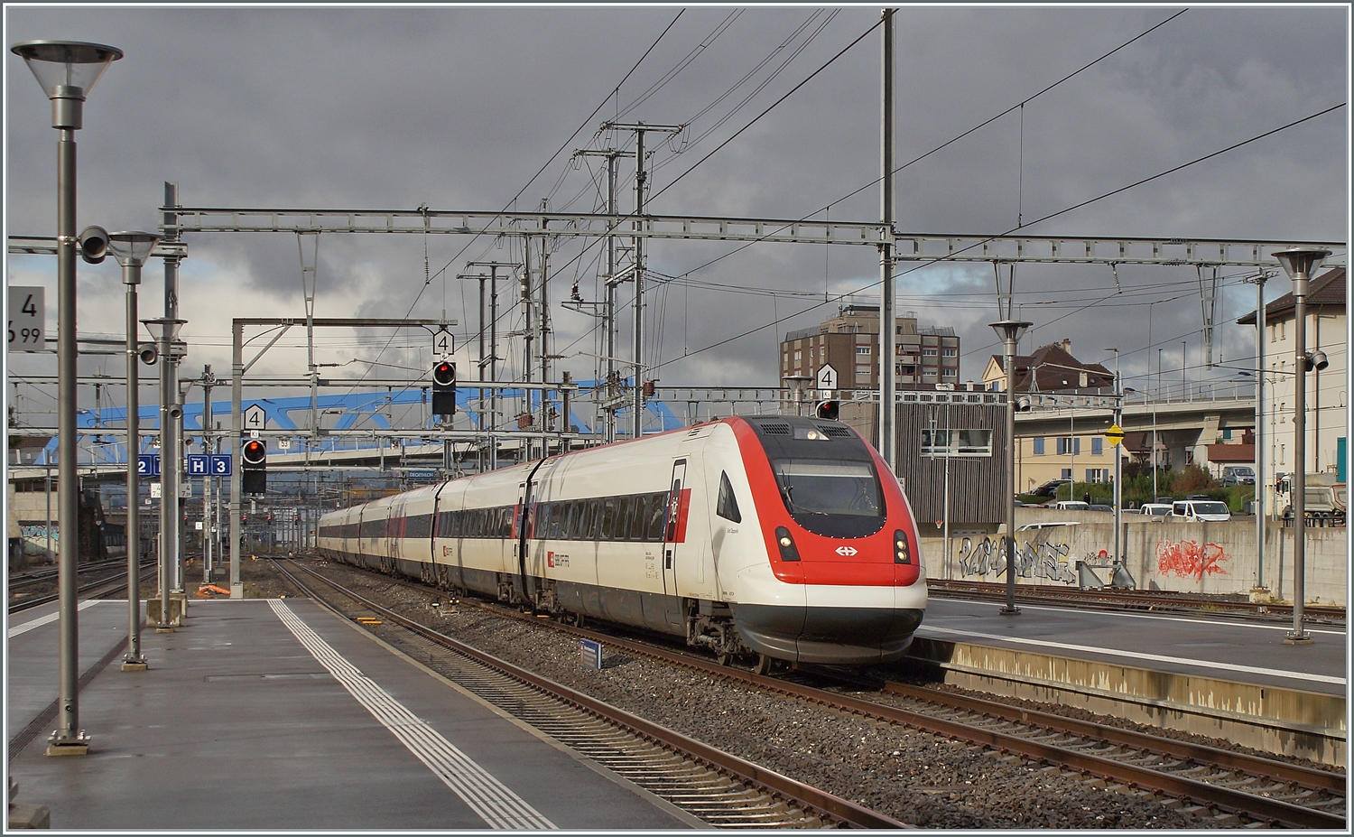 Ein SBB RABDe ICN 500 von Lausanne nach Zürich fährt in Chavonray ohne Halt durch.