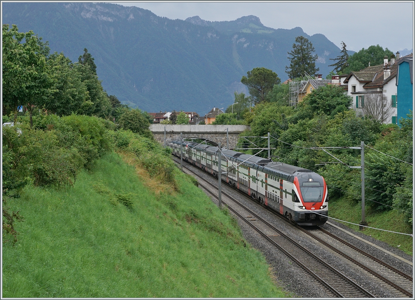 Der SBB RABe 511 111 und ein weiterer sind bei La Tour de Peilz als RE 33 auf dem Weg von Annemasse (F) nach St-Maurice.