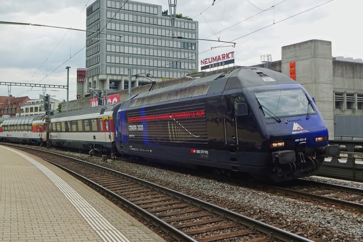 Aprikosenblüte im Wallis und im Hintergrund liegt noch Schnee auf den Bergen. Die SBB Re 460 fährt mit ihrem, IR Richtng Genève Aéroport zwischen Saxon und Charrat-Fully durchs Wallis.