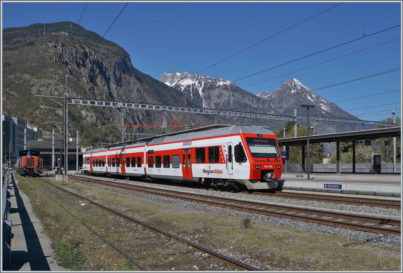 Der RegionAlps RABDe 525 038 von Martigny nach Le Châble hat Sembrancher erreicht, und der Gegenzug verlässt sogleich Sembrancher in Richtung Martigny.