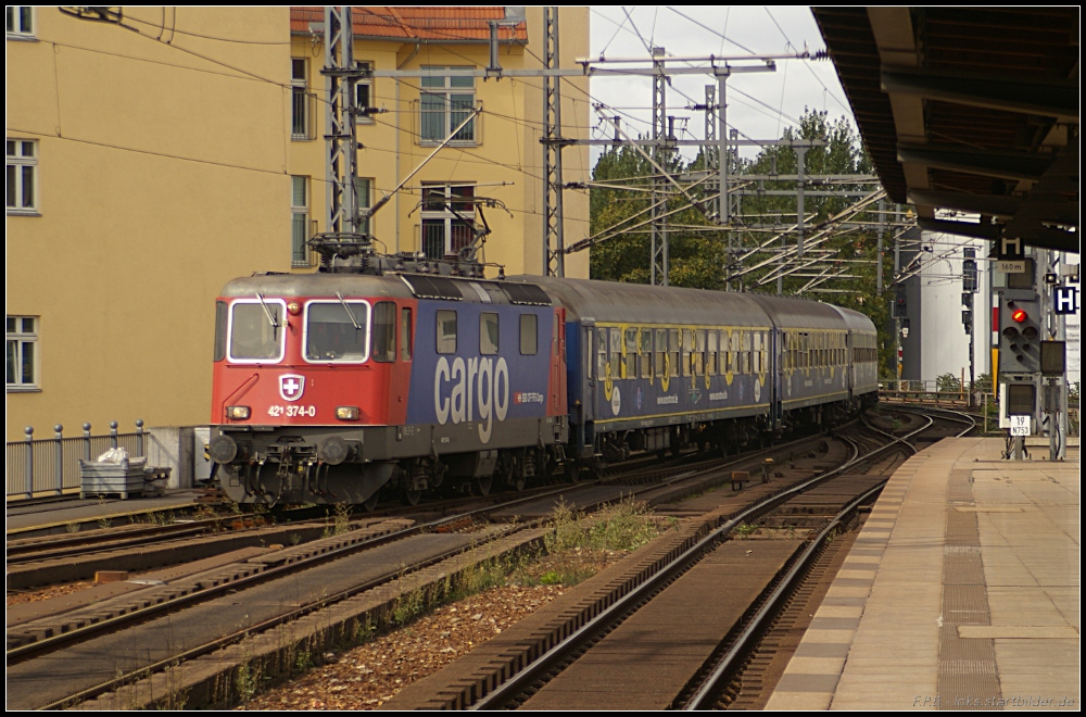 SBB cargo 421 374-0 mit dem Leerpark des  Sonderzug Nord , der Leute zur Anti-Atom-Demo nach Berlin Hauptbahnhof brachte (gesehen Berlin Friedrichstraße 18.09.2010)