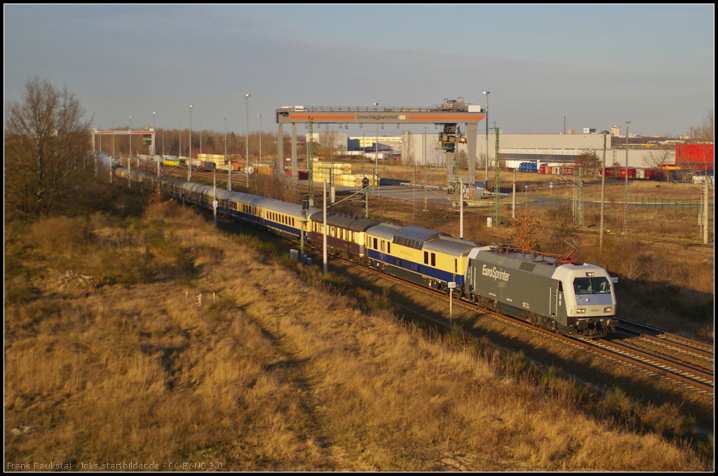 PCW 8 / 127 001 fährt mit dem DPE 25045 am 08.03.2014 am KV Terminal in Grossbeeren vorbei. Ab Ludwigsfelde wird die am Zugschluss mitlaufende 03 1010 dann Zuglok sein