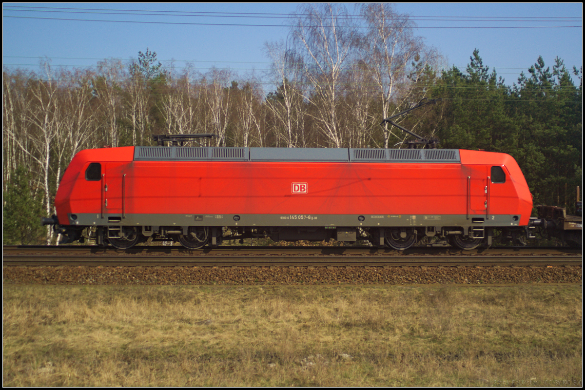 Damit sich DB Cargo 145 057-6 noch einmal im Profil präsentieren konnte, hatte die Sonne am 09.04.2018 doch noch ein Einsehen als die Lok mit ihrem Stahlzug durch die Berliner Wuhlheide fuhr.