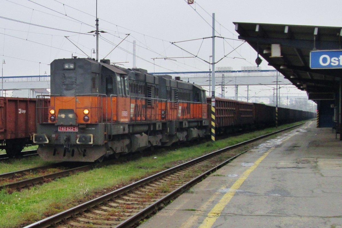 Am verregneten 28 Mai 2015 treft ein AWT-Kohlezug mit 740 622 in Ostrava hl.n. ein.