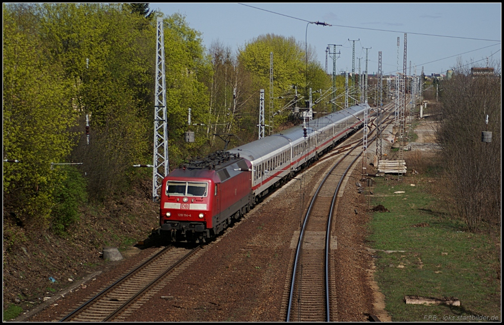 DB Fernverkehr 120 114-4 mit einem IC Richtung Süden unterwegs (gesehen Berlin Kreuz Genshagener Heide 10.04.2011)