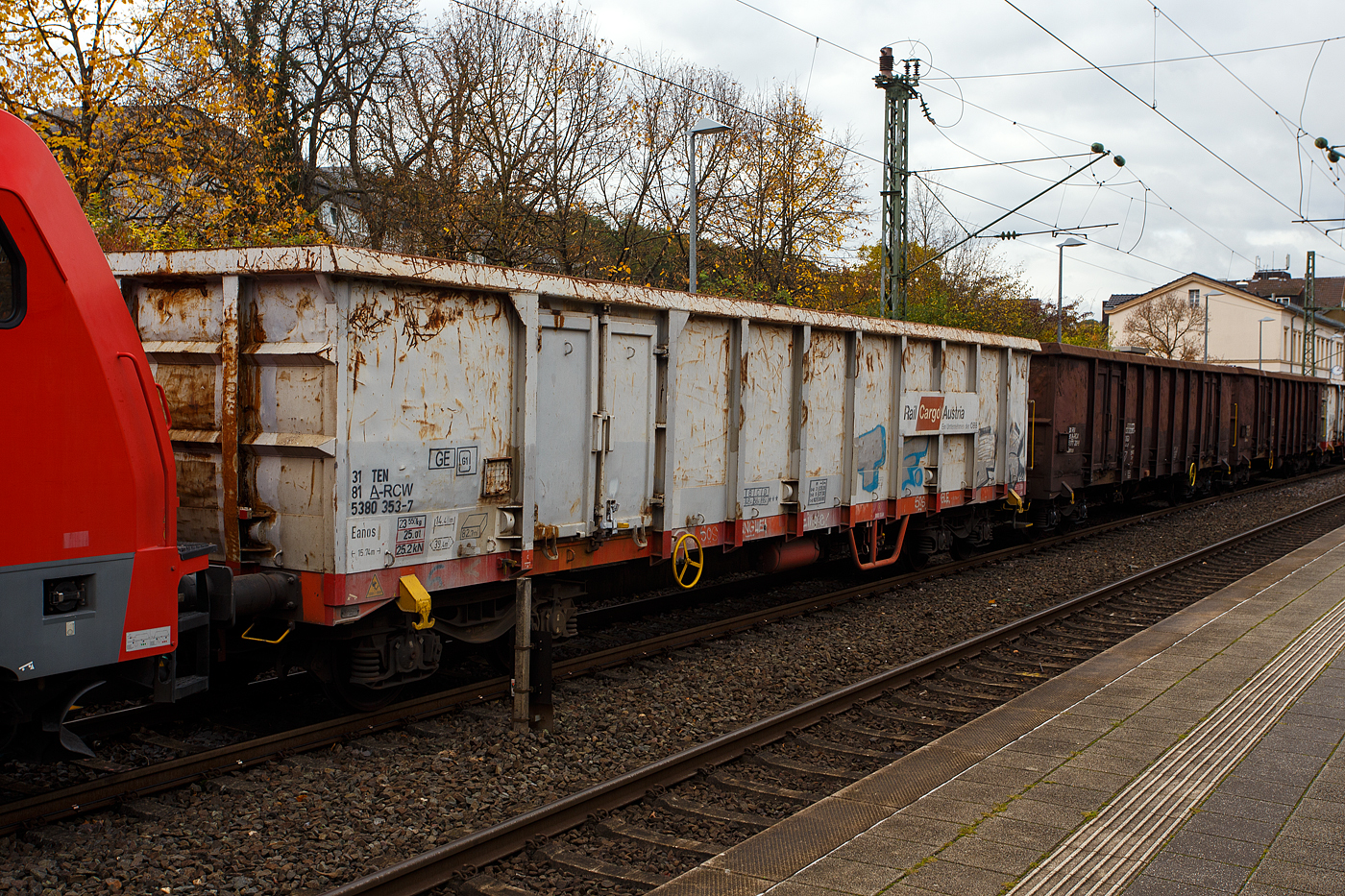 Vierachsiger gedeckter Drehgestell-Großraumschiebewandwagen, 31 81 2742 021-0 A-RCW, der Gattung Habbiins, der Rail Cargo Austria (zur ÖBB), am 12.09.2022 im Zugverband bei einer Zugdurchfahrt im Hbf Salzburg.