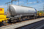 4-achsiger Drehgestell-Zementsilowagen 33 85 9326 254-0 CH-VICEM, der Gattung Uacns, der Ciments Vigier SA (Schweiz) am 18.05.2018 in einem Zugverband beim Signalhalt im Bahnhof Yverdon-les-Bains (VD).