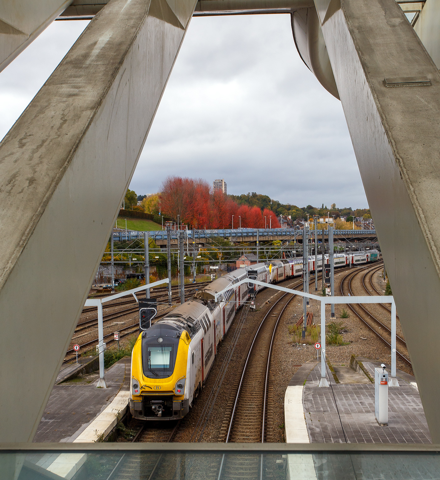 Ein sehr langer M7 TWINDEXX-Triebwagen-Zug hat am 21 Oktober 2025, als IC über Brüssel Flughafen, Gent und Brügge, an die Küste nach Knokke, den Bahnhof Liège-Guillemins verlassen.