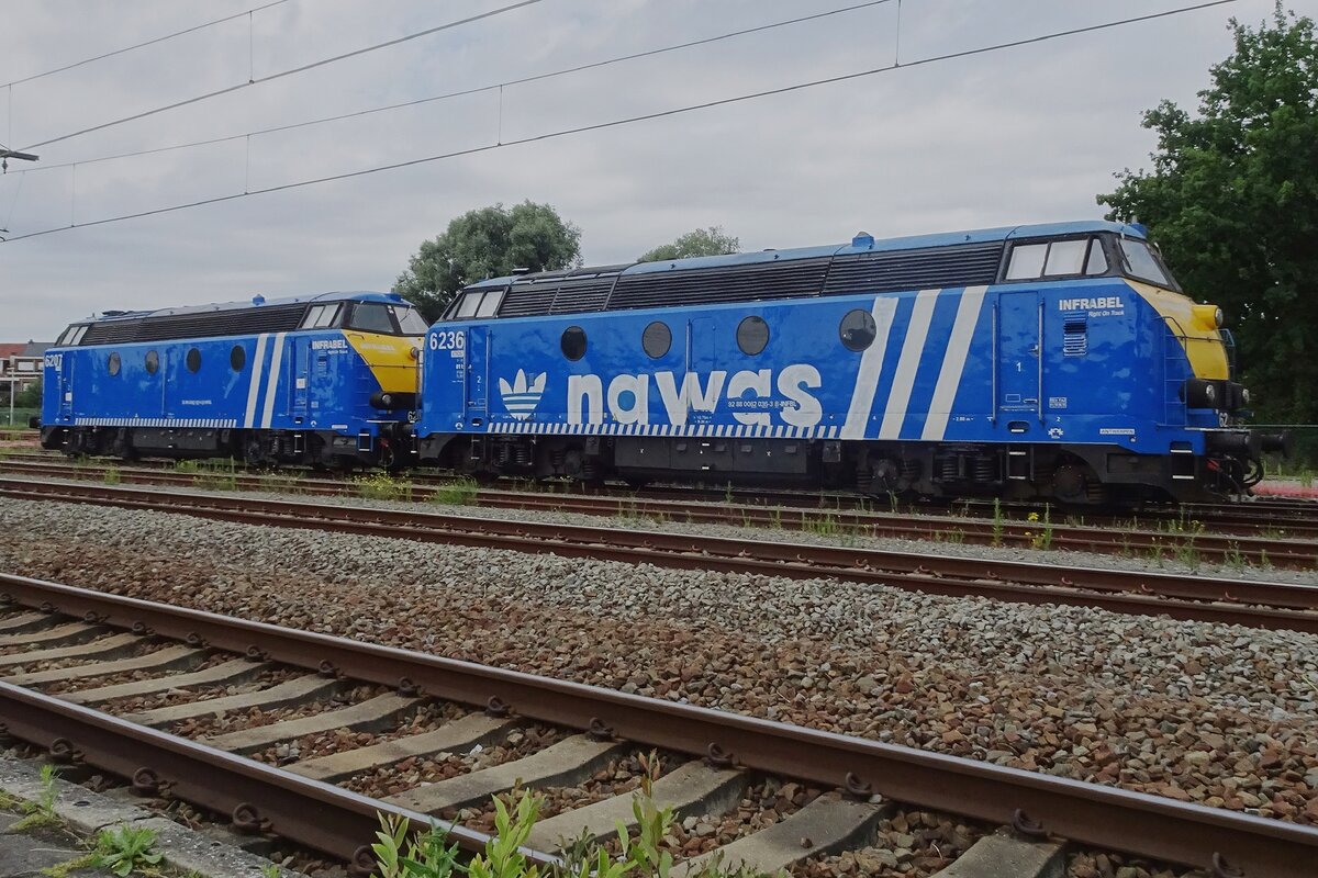 Am grauen Morgen von 14 Juli 2022 steht Infrabel 6236 mit ein Schwesterlok in Lier abgestellt.