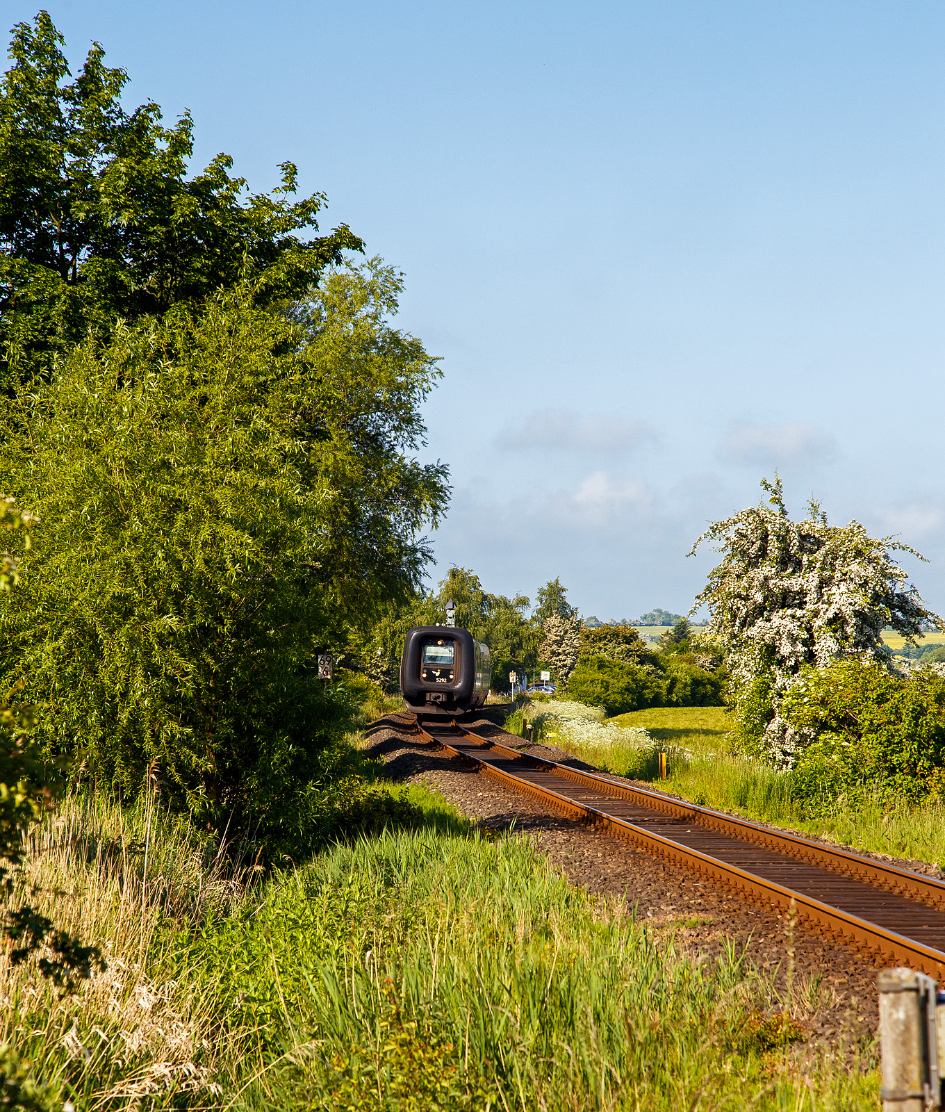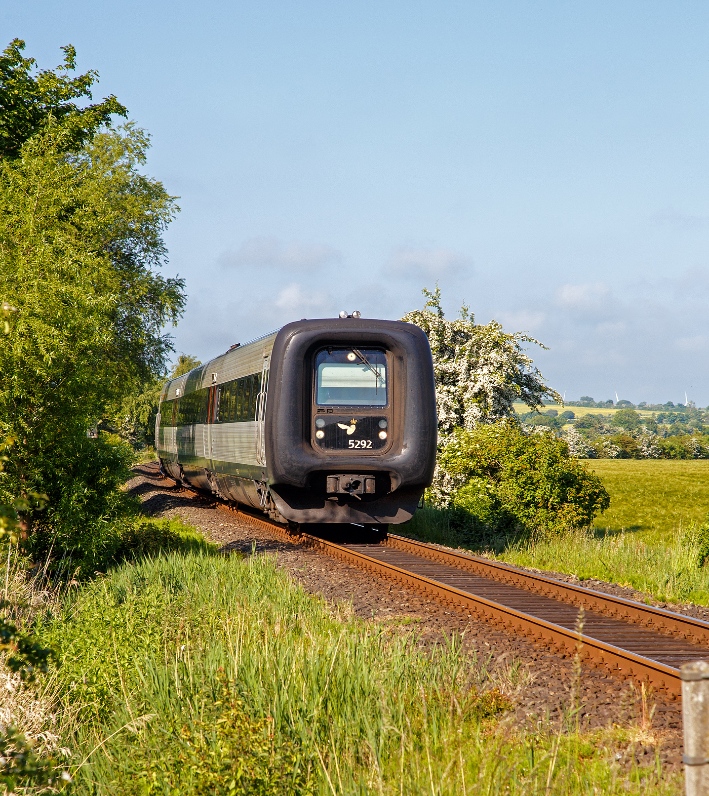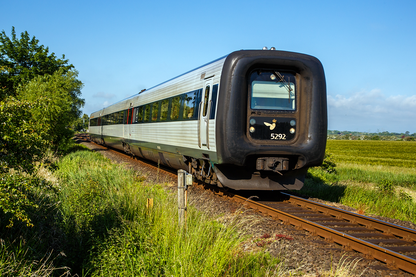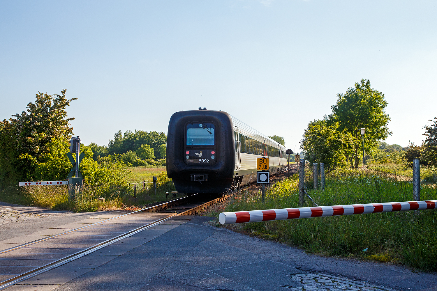 Die DSB Gumminase bzw. der DSB IC 3 – MFB 5292 / FF 5492 / MFA 5092 (DSB-Baureihe MF) fährt am 12.06.2015 als EC 31 (Hamburg - Lübeck - Puttgarten - Rödby - Kopenhagen), hier auf der „Vogelfluglinie“ beim Bü 69,8 der Bahnstrecke Lübeck–Puttgarten (KBS 141) bei Großenbrode .