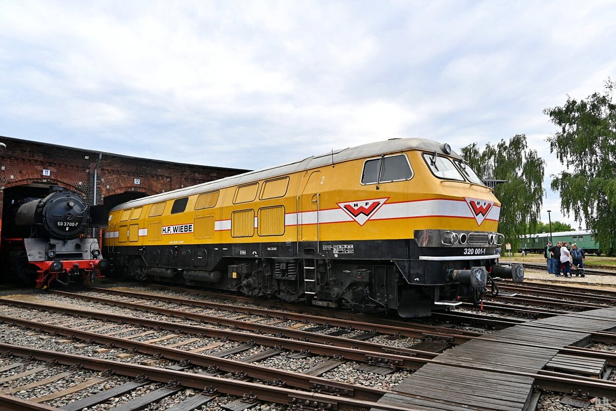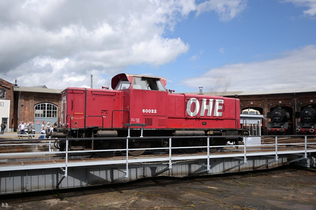 Lok der BR V22 des Klein- und Privatbahnmuseums Gramzow auf vereinseigener Strecke im Bahnhof Damme.