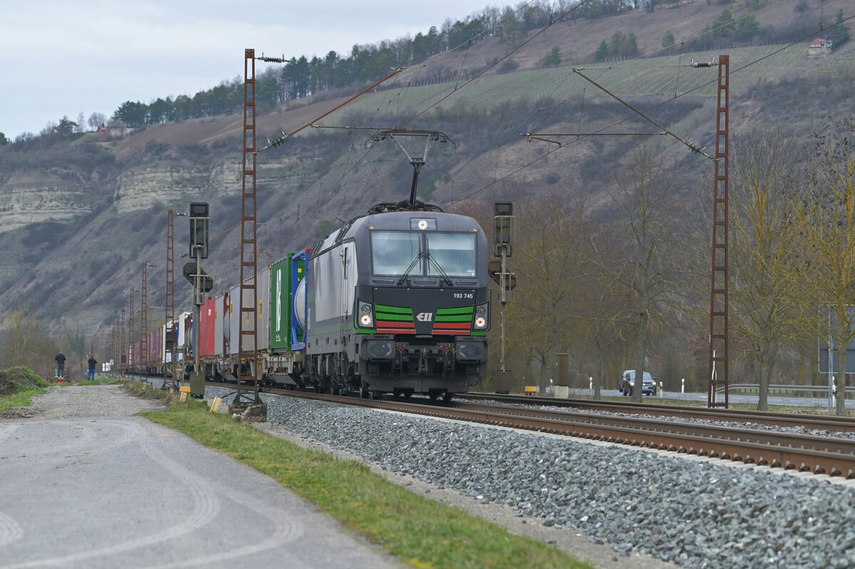 193 745 ist mit einem KLV am Sonntag den 17.2.2024 bei Thüngersheim gen Würburg fahrend zusehen.
