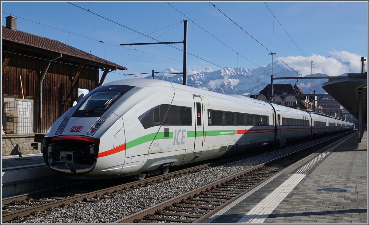 Ein DB ICE 4 auf der Fahrt von Berlin nach Interlaken Ost ist in Spiez eingetroffen und somit schon bald am Ziel seiner langen Fahrt.
