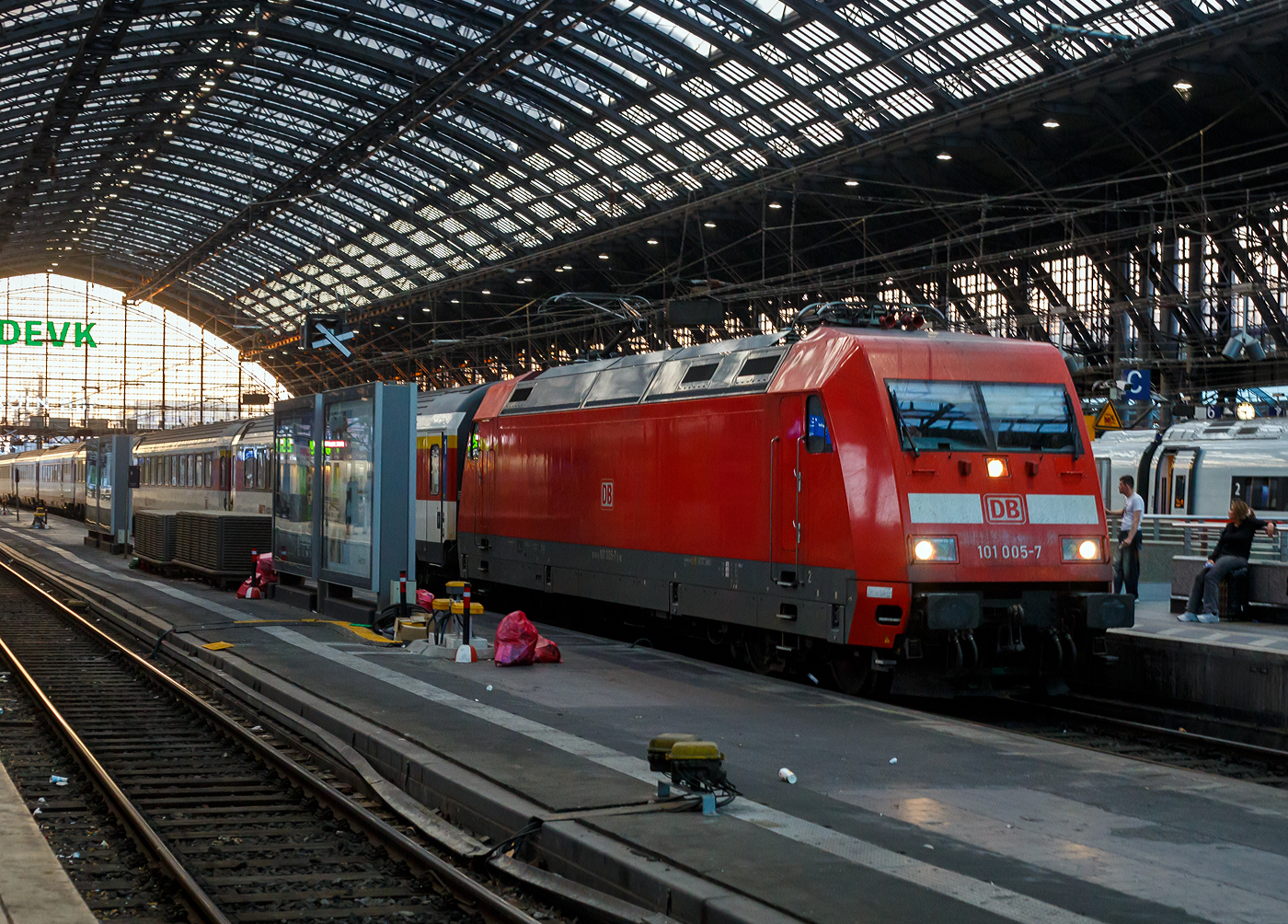 Die DB 101 005-7 (91 80 6101 005-7 D-DB) der DB Fernverkehr AG, fährt am 01 Juli 2025, mit dem EC 6 (Interlaken Ost - Bern - Basel SBB – Mannheim - Köln Hbf - Dortmund Hbf), mit über 2 Stunden Verspätung in den Hauptbahnhof Köln ein. Hinter der DB 101er sind SBB EuroCity-Wagen. Die EuroCity-Wagen (Apm EC und Bpm EC) der SBB sind zwar nach ähnlichen Prinzipien aufgebaut worden, werden aber in der Schweiz nicht als Einheitswagen bezeichnet. Die Lok wurde 1996 von ADtranz (ABB Daimler-Benz Transportation GmbH) in Kassel unter der Fabriknummer 33115 gebaut.