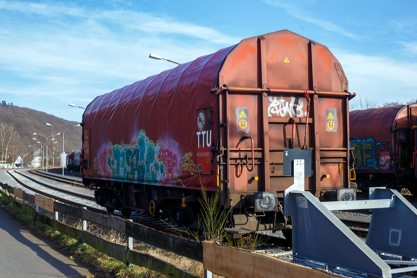 Fabrikschild LHB - Linke-Hofmann-Busch GmbH, Salzgitter-Watenstedt, 1972, Fabriknummer 407 an dem vierachsigen Drehgestell-Flachwagen mit verschiebbaren Teleskophauben für Coiltransporte, 31 80 4671 011-3 D-DB, der Gattung Shimmns-u 708, der DB Cargo AG, am 16 Juli 2025 im Zugverband, im Zug 9921, bei einer Zugdurchfahrt mit Hp 0 Halt in Kirchen (Sieg) in Richtung Siegen. Rechts ist zudem der Laufzettel des Wagons, hier kann u.a. erkennen, was die Ladung wiegt (65.055 kg) und das Ziel (Kreuztal-Eichen TKSE / Eichener Walzwerk).